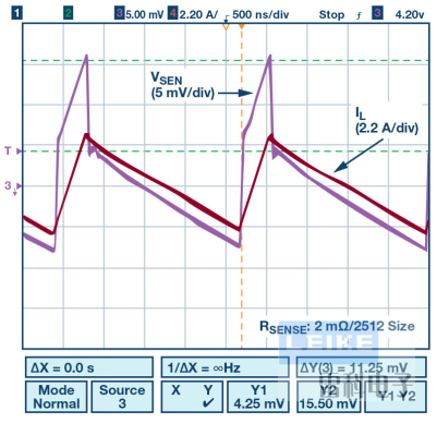 檢測(cè)電阻ESL的影響可能很輕微,也可能很嚴(yán)重。ESL會(huì)導(dǎo)致開關(guān)柵極驅(qū)動(dòng)器發(fā)生明顯振蕩,從而對(duì)開關(guān)導(dǎo)通產(chǎn)生不利影響。它還會(huì)增加電流檢測(cè)信號(hào)的紋波,導(dǎo)致波形中出現(xiàn)電壓階躍,而不是預(yù)期的如圖3所示的鋸齒波形。這會(huì)降低電流檢測(cè)精度。